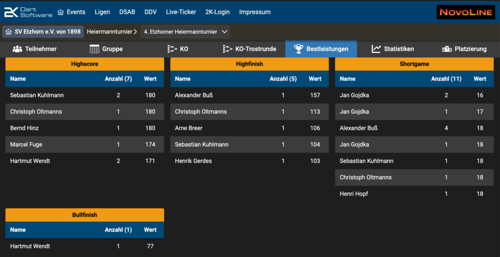 - 🥈 Platz 2: Hartmut Wendt – Der Lokalmatador zeigte einmal mehr, dass er zur Etzhorner Spitze gehört. Mit einem Average von 58,1, einem Bullfinish von 77 und gleich zwei Highscores von 171 unterstrich Hartmut seine Klasse und musste sich lediglich Alexander geschlagen geben.