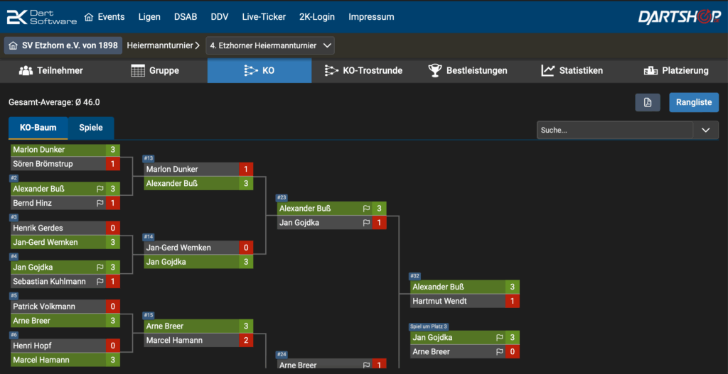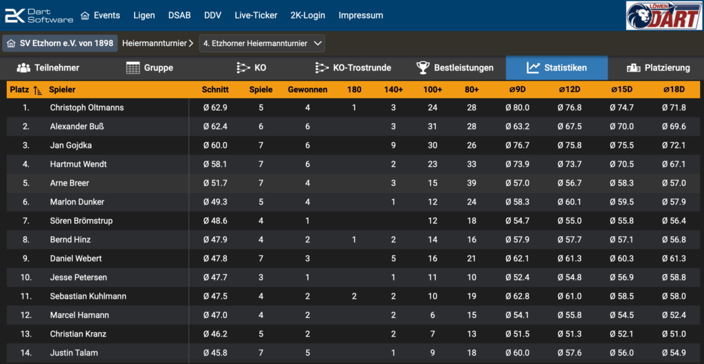 - 🥉 Platz 3: Jan Gojdka – Mit einem stabilen Average von 60,0 bewies Jan, warum er beim Heiermann-Turnier längst eine feste Größe ist. Er glänzte vor allem in den Shortgames: zweimal 16 Darts, einmal 17 Darts – starke Leistung!