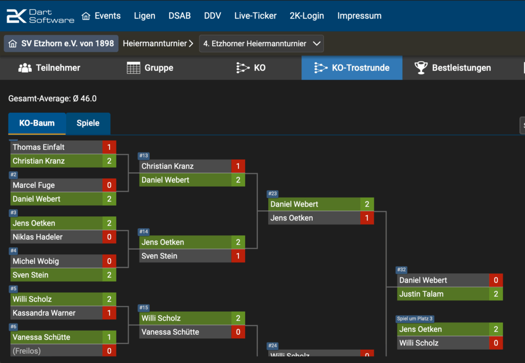 In der KO-Trostrunde konnte sich Justin Talam gegen Daniel Webert den ersten Platz sichern. Im Spiel um Platz 3 setzte sich Jens Oetken gegen Willi Scholz durch – ebenfalls mit spannenden Begegnungen und guter Laune an den Boards.